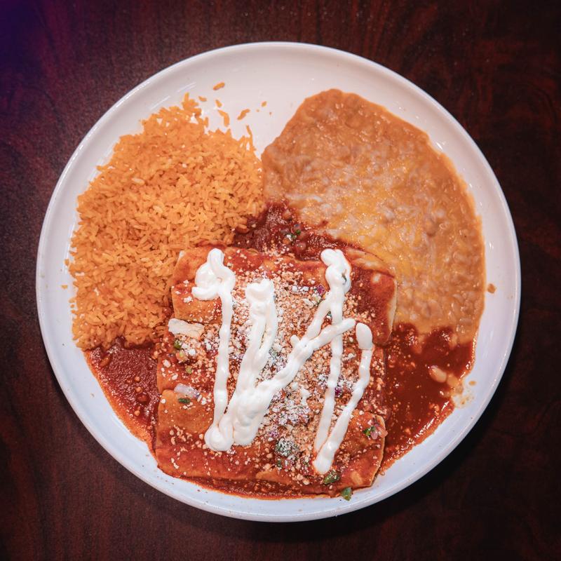 2 Tortillas, filled with your choice of seasoned meat, are draped in a velvety poblano sauce and served with a side of rice and beans.